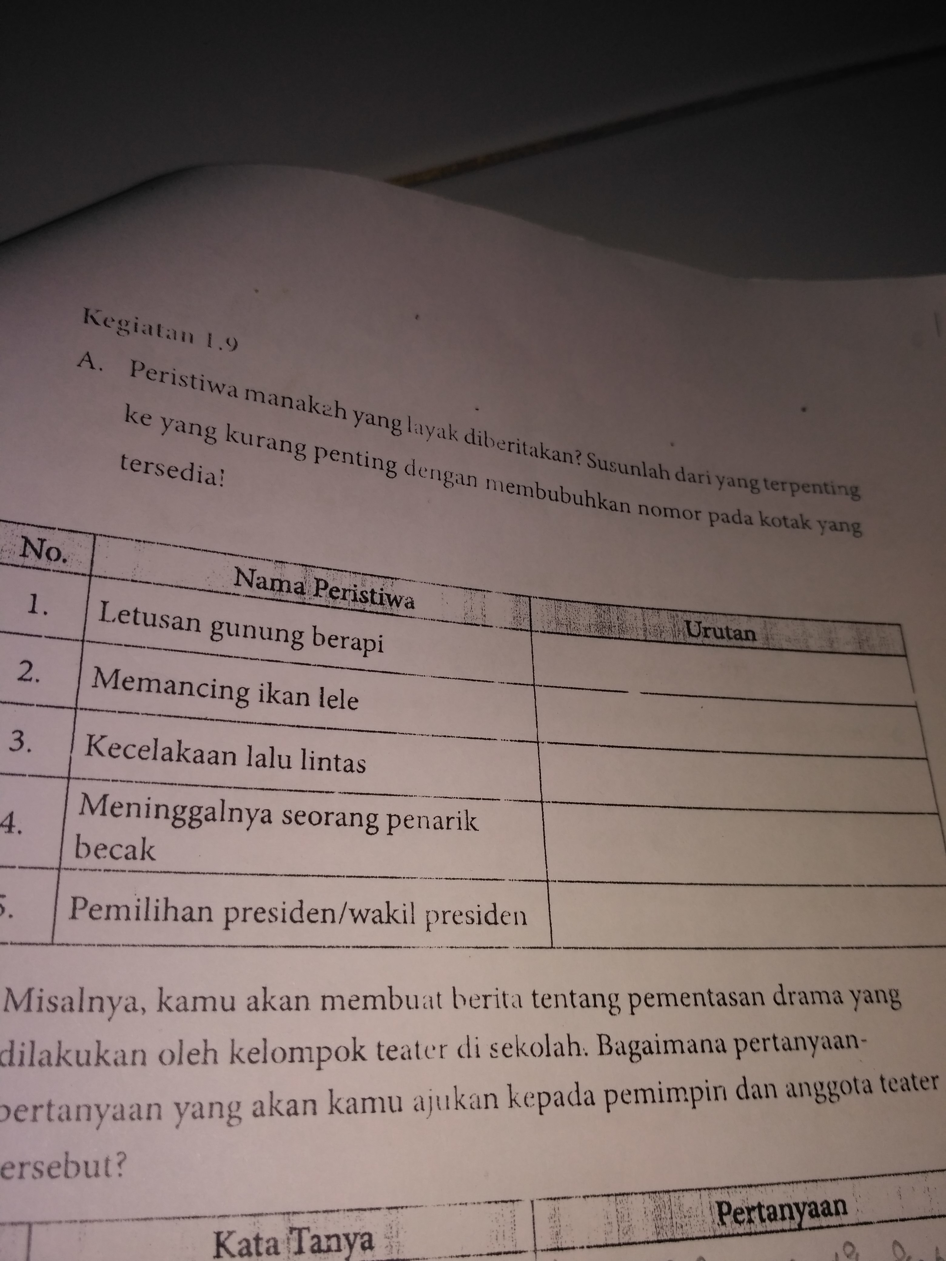 Kemukakan sebuah contoh teks prosedur yang kamu temukan dari koran atau majalah contoh jawaban setiap jawaban ini tidak mengikat. Teks prosedur protokol adalah teks yang pada setiap langkahnya bisa diubah tidak harus runut, walaupun berubah, tetapi hasil akhirnya tetap sama. Misalnya, jika memasak mie instan kita bisa merebus dengan memasukan mie dan bumbu kedalam air rebusan dari tungku atau bisa memasukan air panas kedalam wadah yang berisi mie lalu memasukan bumbu. Artinya, peserta didik dibenarkan dengan jawaban berbeda selama substansinya benar. See full list on dosenpendidikan.co.id Teks prosedur kompleks yaitu teks yang berisi banyak langkah dalam melakukannya. Contohnya, cara membuat sambal balado, cara mengajukan pembuatan kartu sim, cara memperpanjang stnk, prosedur pembuatan ktp. Kemukakan sebuah contoh teks prosedur yang kamu temukan dari koran atau majalah! 2.membedakan teks ulasan dengan teks uang lain. Pertanyaan yang belum terjawab akan segera mendapatkan ulasan dan pembahasan dari pengunjung lainnya, atau dari tim pengasuh bimbel gurulesprivat.net. 1.memahami teks ulasan dan menangkap maknanya. See full list on dosenpendidikan.co.id Silahkan baca pembahasan dan jawaban atas pertanyaan kemukakanlah sebuah contoh teks prosedur yang kamu temukan dari koran atau majalah di bawah ini.